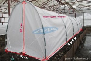 Парники с конструкцией, в которой дуги каркаса вставляются в прошитые отверстия в укрывном материале и растягиваются гармошкой, очень популярны из-за простоты и удобства. Но есть некоторые моменты, которые постоянные пользователи этих парников просят доработать и улучшить. Учитывая, что рынок наполнен похожими по конструкции, но одноразовыми парниками откровенно плохого качества, компания Даяс полностью обновила все комплектующие своего парника, изменила схему пошива чехла и выпустила новую «продвинутую» модель парника, которая вобрала в себя все преимущества прежней конструкции и избавилась от присущих ей недостатков. Новая модель отличается своей упаковкой от всех аналогичных парников. Модель получила название « АНАНАС».
