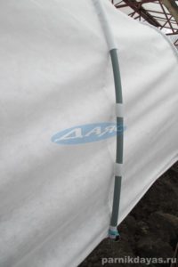 1) Короткие рукава и капроновые петли. В прежней модели парника, чтобы сдвинуть материал вверх вдоль дуг для доступа внутрь парника, нужно было несколько раз проходить туда-сюда вдоль всей длины парника, поочередно приподнимая материал на каждой дуге небольшими порциями. При этом материал сдвигаемого рукава постоянно натягивался, терся о дуги и быстрее изнашивался от этого. Чтобы устранить эту проблему, в новых парниках Ананас рукава сделаны короткими. Они есть только в верхней части парника, теперь их вообще не надо трогать. А по бокам парника пришиты широкие капроновые петли, которые и удерживают дугу. Эти петли легко и быстро сдвигаются вместе с материалом чехла, рукав не задействуется вообще. Это гораздо удобнее. Одновременно это решает другую проблему – клипсы, когда их крепят на рукав, чтобы материал не задирался от ветра, постепенно рвут его своими концами, рукав становился дырявым и начинает расползаться весь. Теперь клипсы крепятся не на рукав! Они защелкиваются на эти капроновые петли. А петли сделаны из износостойкого прочного капрона.