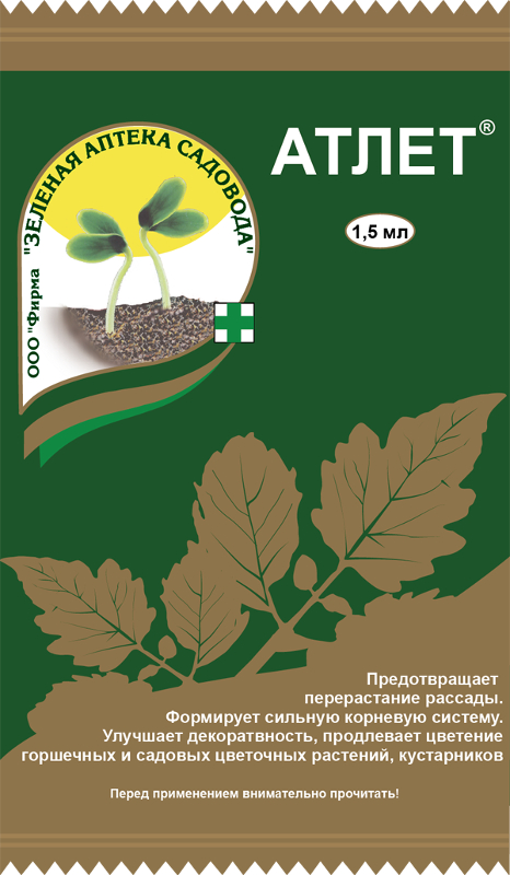 • Механизм действия. Атлет проникает в растения через листья (опрыскивание) или корни (полив). Препарат замедляет рост надземной части, вызывает укорачивание и утолщение стебля, увеличивает ширину листьев. В растениях происходит перераспределение питательных веществ. Большая часть питательных веществ поступает в корни, вызывая их усиленный рост.