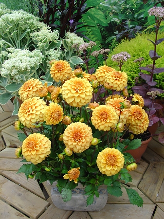 – еще одна группа популярных в последнее время низкорослых георгин. Цветок у георгин Гелери полностью махровый, диаметром 6-10 см, имеет плоские лепестки (язычковые цветки), слегка закрученные и отогнутые к стеблю, что делает его необыкновенно пышным. Высота георгин Гелери не превышает 30-35 см. Они не требуют дополнительных опор, цветут продолжительно и очень обильно. Георгины Гелери отлично подходят для переднего края бордюра, а также в качестве контейнерных посадок для украшения террас, балконов и веранд.