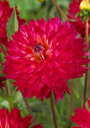 Георгина Соулмейт. Однолетнее декоративное клубневое растение относится к группе бахромчатые. Куст компактный, ветвистый, стебли прочные, полые высотой 120 см. Листья перистые темно-зеленые, многочисленные. Соцветие махровое, ярко-красное с тонкими белыми одиночными штрихами, диаметром 15 см. Лепестки свернуты в трубочки с сильно рассеченными кончиками. Высаживают в конце мая — начале июня, когда минует опасность заморозков. Расстояние между растениями при посадке 30-40 см и 5-7 см над клубнем. Предпочитает солнечные места, защищенные от ветра, плодородные хорошо дренированные почвы. Используется для групповых посадок и на срезку. Цветет в июле-октябре. На зиму клубни выкапывают и хранят в погребах, подвалах при температуре 3-6 градусов и относительной влажности 50-60 %. Георгины размножают делением клубней.