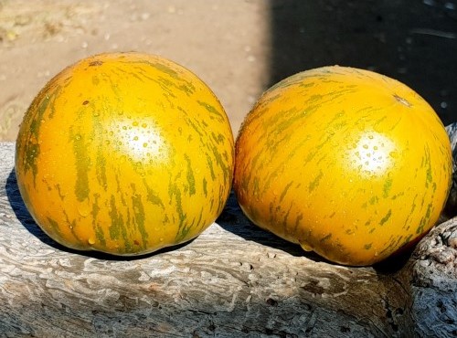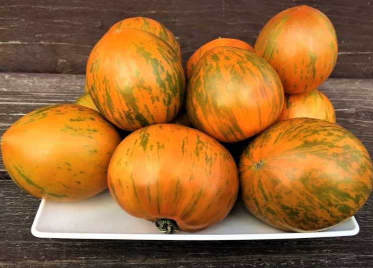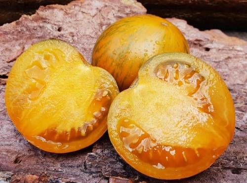 Среднеспелый высокоурожайный сорт с крепким иммунитетом. Детерминант, штамб, 0,5-0,7 м. Может выращиваться не только в открытом, но и защищенном грунте или контейнерах. Лист картофельный морщинистый. Плоды овальные или слегка сердцевидные, массой 200-300 г., мясистые, сладкие, с мякотью необычного горчичного цвета и фруктовым послевкусием. Очень интересный цвет томатов: оттенок «охры» с зелеными полосками и штрихами. Яркий, запоминающийся аромат!