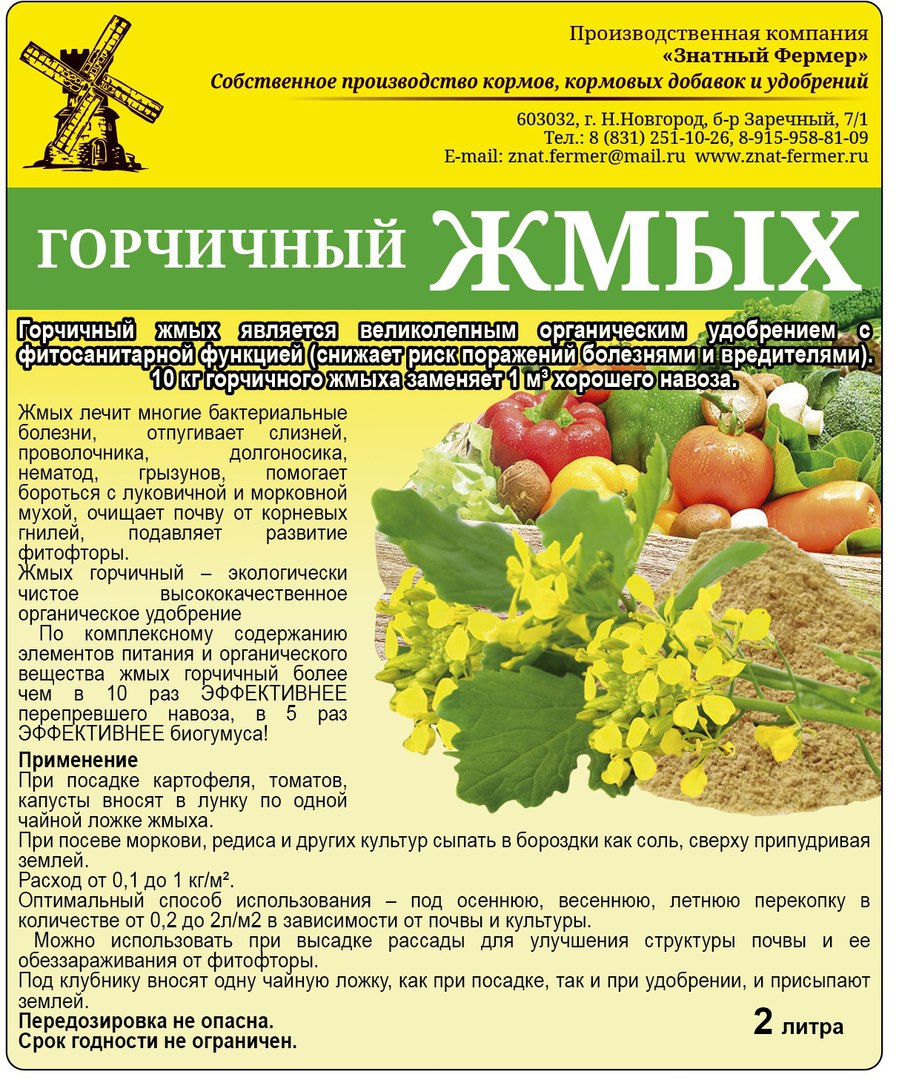 Экологически чистое высококачественное органическое удобрение представленное в виде, однородного по составу крупно помолотого порошка, получаемого в результате переработки семян горчицы. Горчичный жмых является великолепным органическим удобрением с фитосанитарной функцией (снижает риск поражений болезнями и вредителями), а также выполняет роль биотоплива (10 кг горчичного жмыха заменяет 1 м³ хорошего навоза.) Содержание в жмыхе жирных кислот и эфирных масел придаёт удобрению фитосанитарную функцию – лечит многие бактериальные болезни, отпугивает слизней, проволочника, долгоносика, нематод, грызунов, помогает бороться с луковичной и морковной мухой, очищает почву от корневых гнилей, подавляет развитие фитофторы.