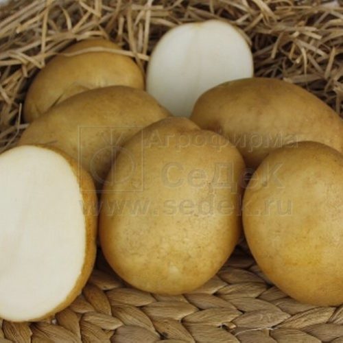 • Клубень овально-округлый, с мелкими глазками. Кожура гладкая, желтая. Мякоть белая. Масса товарного клубня 88-119 г. Вкус отличный.
