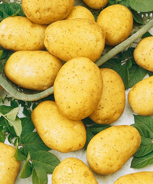 Клубни овальные, кожура жёлтая, гладкая, глазки мелкие, масса 150–200 г, до 20 штук на растении. Содержание крахмала 13-17%.