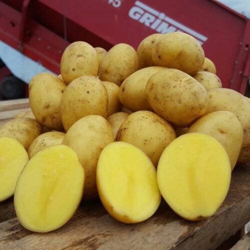 При варке не темнеет. Урожайность рекордная – 650кг с сотки. Сорт устойчив к возбудителю рака картофеля и золотистой картофельной цистообразующей нематоде, к поражению морщинистой и полосчатой мозаиками, черной ножкой, ризоктониозом, мокрой гнилью, вирусами. Сорт отлично хранится. Но иногда и «просыпаться» не спешит. Перед посадкой клубни желательно хорошо прогреть и прорастить для дружных всходов. Рекомендуется за две-три недели до уборки скосить ботву.
