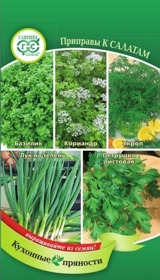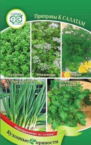 Пряные растения, вошедшие в состав смеси придают салатам неповторимый вкус, их легко и удобно выращивать на даче, они всегда под рукой, свежие — летом или засушенные на зиму. Пряный базилик хорошо сочетается с помидорами, зелеными овощами, яйцами, рыбой и сыром. Чтобы сохранить его неповторимый аромат лучше измельчать его с помощью пальцев и добавлять в блюдо перед подачей. Петрушка, укроп и лук на зелень классические пряности любого сезонного салата. Чтобы подчеркнуть свежий запах петрушки и укропа, можно перетереть их с чесноком и растительным маслом, такая простая заправка, добавленная к нарезанным свежим овощам, придаст особый вкус и аромат блюду. Лук на перо ранняя культура с высоким содержанием витаминов и микроэлементов. Весной, из зелени лука, можно сделать полезный салат с яйцами, заправив его лимонный соком и подсолнечным маслом. Кориандр или кинзу в основном используют как пряность к свежим овощам, но можно зелень или семена добавить в консервированный салат — получится вкусно и необычно.