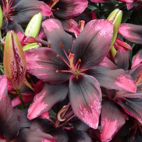 Пурпурно-бордовая, почти черная к середине, кончики розовые. Диаметр цветка 16 см, высота 45 см.