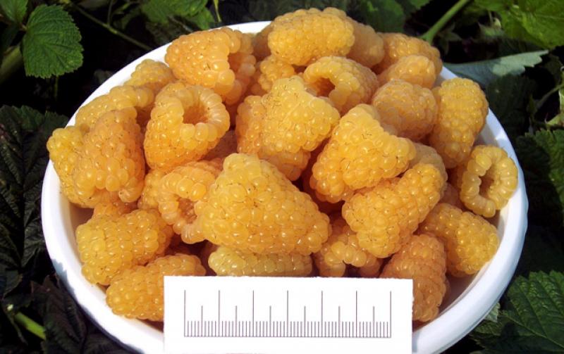 Ремонтантный сорт. Куст средний, средней силы роста, слабораскидистый. Побегообразовательная способность 5-7 побегов на куст. Шиповатость слабая, шипы расположены в нижней части стебля, короткие, средние, мягкие. Ягоды крупные, удлиненно-конические, золотисто-желтые со слабым опушением. Костянки средние, однородные с плодоложем скреплены прочно. Плодоложе удлиненно-коническое. Мякоть средняя, нежная, кисло-сладкая со слабым ароматом. Средняя масса ягоды 5,0 г. Дегустационная оценка 3,9 балла. Средняя урожайность 126 ц/га. По технологии возделывания предусмотрено осеннее скашивание побегов. Универсального назначения использования.