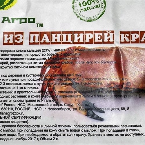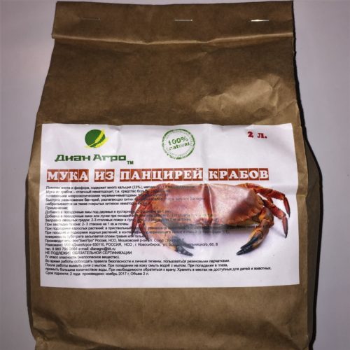 • Мука из панцирей крабов – это богатый источник хитина, который способствует повышению активности полезных микроорганизмов в почве. Хитин – соединение, в состав которого входит азот, по структуре он напоминает целлюлозу. Хитин можно обнаружить в панцирях ракообразных, таких как креветки и крабы, а также в экзоскелете насекомых. Толченый хитин, внесенный в распаханную почву, помогает бороться с корневыми гнилями, мучнистой росой, альтернариозом и фитофторозом, а также корневыми нематодами. Азот в составе хитина способствует активному росту листвы.