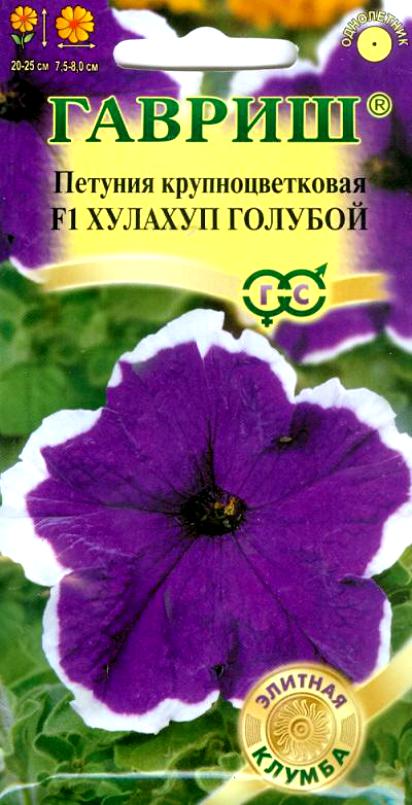 • Популярная в профессиональном озеленении серия гибридных петуний вызовет несомненный восторг у садоводов-любителей. Отличается суперранним (в среднем на 12 дней раньше, чем другие крупноцветковые петунии) цветением. Компактный  сильноветвистый кустик обильно усыпан бархатистыми цветками (7,5-8,0 см в диаметре) пурпурно-синего оттенка с контрастным белым ободком по волнистому краю. Посев проводят с февраля по март поверхностно, под стекло, после появления всходов стекло убирают. При зимнем посеве всходам необходима подсветка. Всходы появляются через 7-12 дней. На постоянное место высаживают, когда минует опасность заморозков. Цветет с конца мая весь сезон. Светолюбива и достаточно засухоустойчива. Предпочитает легкие, плодородные, хорошо дренированные почвы. Серия «Хулахуп» идеальна для выращивания в корзинах, контейнерах, на клумбах, рабатках и бордюрах. Великолепно подойдет для профессионального выращивания на продажу.