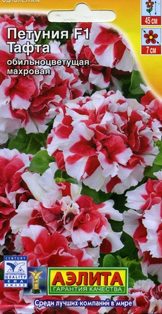 Однолетник Высота растения 45 см Диаметр цветка 7 см Petunia F1 Floribunda Double Новая гибридная обильноцветущая петуния Тафта поражает своими характеристиками. Это чудесное растение отличается компактными побегами с аккуратными листочками и изящными махровыми цветками, которых образуется так много, что кустик напоминает цветущее облачко. Гибрид отличается прекрасным внешним видом, ранним, продолжительным и очень дружным цветением, неприхотливостью и устойчивостью к неблагоприятным погодным условиям. Петуния незаменима в оформлении клумб, бордюров, вазонов, кашпо и балконных ящиков. Посев: Семена в гранулах! Для того, чтобы облегчить посев и выращивание мелкосемянных культур, была разработана система покрытия каждого семечка специальным составом. При попадании влаги на гранулу — оболочка рассыпается. Посев февраль-апрель на рассаду. Гранулы располагают по поверхности слегка уплотненной и увлажненной почвы, не заделывая их, увлажняют из распылителя, накрывают стеклом и содержат при температуре 20-24°С, не допуская пересыхания оболочки гранулы и компоста до момента прорастания сеянцев и, периодически, убирая с поверхности стекла капли конденсата. Всходы появляются только на свету (исключая попадания прямых солнечных лучей) на 10-15 день. После появления первого настоящего листа посевы проветривают. И в дальнейшем снимают стекло, постепенно снижая температуру до 14-16°С. Рассада плохо переносит высокую температуру и переувлажнение. Закаленную рассаду высаживают в грунт после окончания весенних заморозков на расстоянии 15-20 см. Уход: лучше растет на хорошо освещенных местах с легкой, плодородной почвой. Благодарно отзывается на поливы и регулярные подкормки.