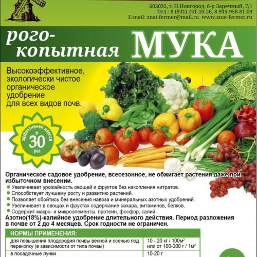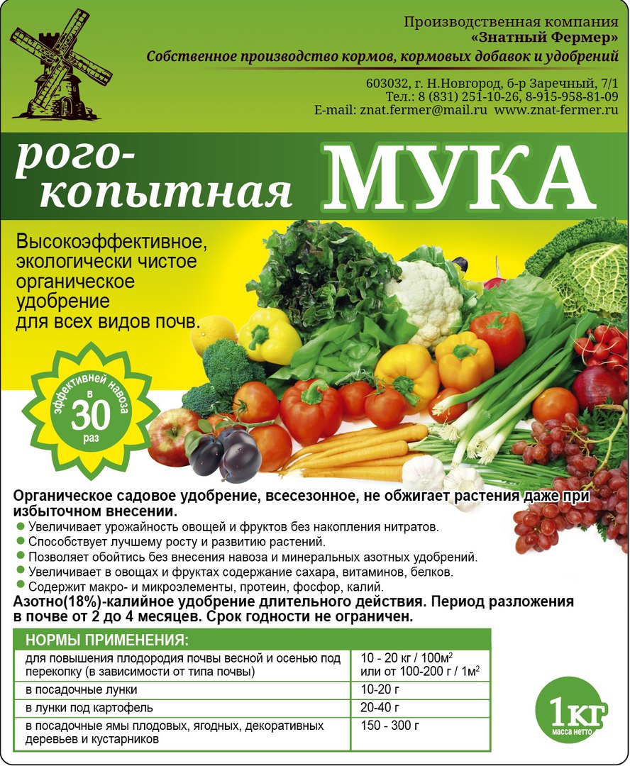 Производится из перемолотых рогов и копыт. Характеризуется повышенным содержанием азота. Преимуществом рогокопытной муки считается ее химическая безопасность для растений (азот, способный обжечь корни растения, выделяется очень медленно). Этот вид удобрений вносится не ежесезонно, а чаще, через каждые 2-3 мес. Первую подкормку грунта рогокопытной мукой осуществляют непосредственно перед высадкой, следующую порцию вносят перед началом периода цветения. Преимущество ее в том, что она применяется для выращивания всех видов сельскохозяйственных культур (овощных, бахчевых, ягодных, фруктовых, злаковых, а также кустарников и хмеля), а также активно нейтрализует фитотоксичность, снижает кислотность почвы и улучшает ее физические и агрохимические свойства.
