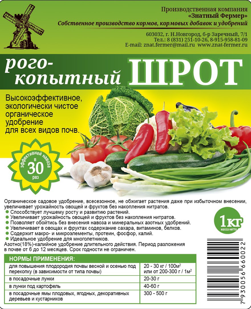 Органическое азотно-калийное удобрение, предназначенное для выращивания рассады всех видов овощных культур, а также цветочных и декоративных растений, плодово-ягодных, хвойных и лиственных культур в условиях слабокислой или нейтральной среды. Одним из видов альтернативных форм азотных удобрений является кератин, это вещество, образующее рога и копыта. Рога и копыта богаты азотом, содержат его до 17-18%. В кератине азот находится в неусвояемой форме для растений, поэтому в технологическом процессе производства удобрений он предварительно подвергается разложению. Преимущество этого вещества по сравнению с минеральными формами азота в том, что кератин разлагается постепенно под воздействием почвенных микроорганизмов, и постепенно освобождается азот в усвояемой форме. В связи с этим он не накапливается в значительных количествах и почти не выщелачивается, быстро потребляется растениями по мере освобождения. Большое значение органического вещества в повышении плодородия почвы в первую очередь рассматривается в связи с содержанием в нем азота. Кроме того, само вещество, внесенное в почву, улучшает физические и химические свойства почвы, ее водный и воздушный режимы, способствует активизации микробиологических процессов. Применение рогокопытного шрота совместно с мочевиной и комплексом микроэлементов значительно увеличивает силу роста, скорость созревания и урожайность сельскохозяйственных культур. Рогокопытный шрот является одним из компонентов грунтов для РОЗЫ.