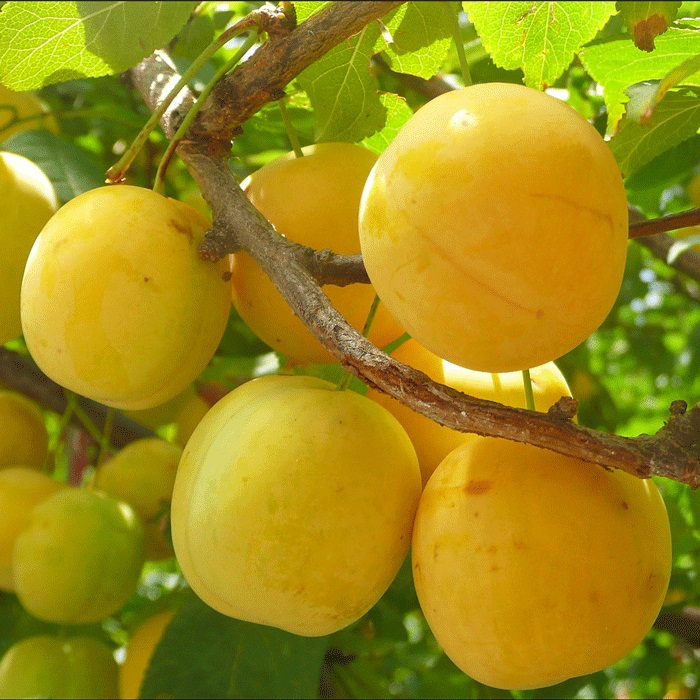 Сорт зимостойкий, устойчивый к грибным болезням, скороплодный. Дерево среднерослое, с округло-конической кроной. Плоды созревают уже в конце июля. Они очень крупные — 40-50 г, округлой формы, с ярко-выраженной бороздой, делящей плод на две равные половины. Кожица ярко-желтая, с небольшим светлым восковым налетом. Мякоть желтая, сочная, кисло-сладкая. Урожайность 35-40 кг с дерева.