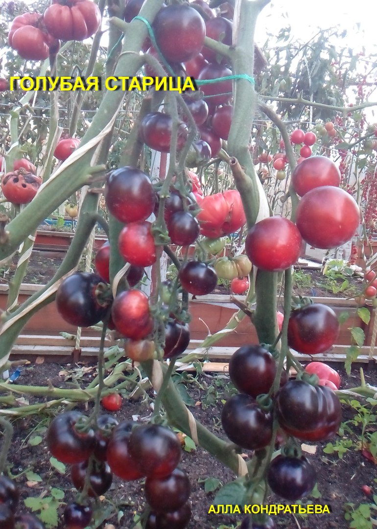 Среднеспелый, высокорослый, до 1,5м. Плоды круглые, красно-синие, очень хороший, взрывной вкус, массой до 100г. При обилии солнечных лучей плоды приобретают полностью сине-черный восхитительный цвет. Листья и стебли имеют голубой оттенок.