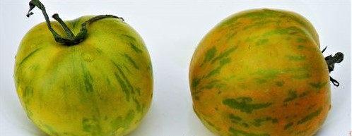 Среднепоздний, 105-125 дней, индетерминатный, высокорослый кистевой рост. Образует одновременно 7-9 длинных, простых кистей, в которых собраны по 15-16 плодов оригинальной расцветки и формы. Незрелый плод – зелёно-жёлтый, в тёмную полоску, при поспевании становится тёмно-жёлтым, можно сказать оранжевым, с зелёными полосками и штрихами. Томаты овальной формы, с лёгкой ребристостью, весом от 60 до 100 гр-120г. Мякоть внутри салатного цвета, десертно-сладкого вкуса, с привкусом экзотических фруктов. Суперустойчив к болезням, до морозов стоит зеленый. Плодов на кусту необычно много! Универсального применения – везде вкусен!