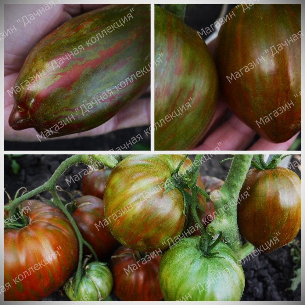 Среднеспелый высокорослый урожайный сорт с очень необычными по форме и расцветки плодами. Растение индетерминантное, высотой в теплице около 1,5м. Помидоры перцевидно-грушевидной формы, неровные, в стадии зрелости бордово-коричневые, с зелеными полосками и штрихами, массой 100-150г. Мякоть малосемянная, отличного помидорного вкуса. Урожайность высокая и стабильная, около 5 кг. с куста, при соблюдении агротехники. Плоды хороши для свежего потребления, консервирования, заморозки и вяления.