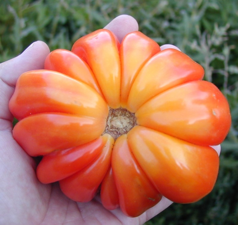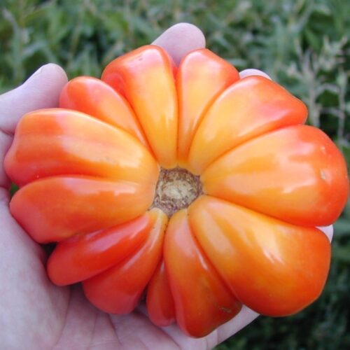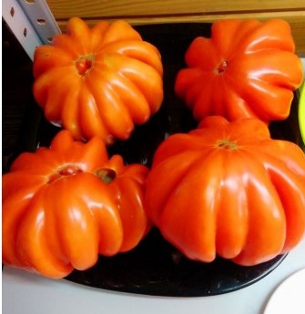 Очень урожайный сорт ребристых помидоров. Вкус тропических фруктов! Украсит любой стол! Длительного плодоношения. Высокорослый (до 2х метров), среднеспелый. Крупные красивые плоды ярко-оранжевого цвета массой до 500г.. Мякоть мясистая, очень сладкая, малосемянная.