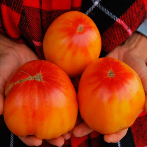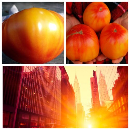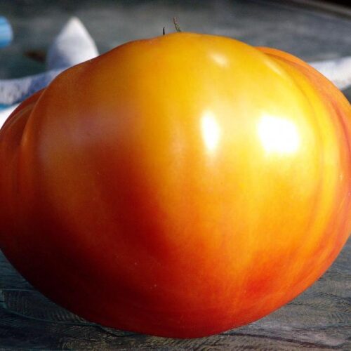 Высокорослый среднеспелый высокопродуктивный сорт. Форма плодов плоскоокруглая, ближе к сердцевидной. Масса томатов от 300 до 500г. Цвет желто-оранжевый с розовыми бликами у плодоножки. Вкусовые качества отменные, томаты очень сладкие.