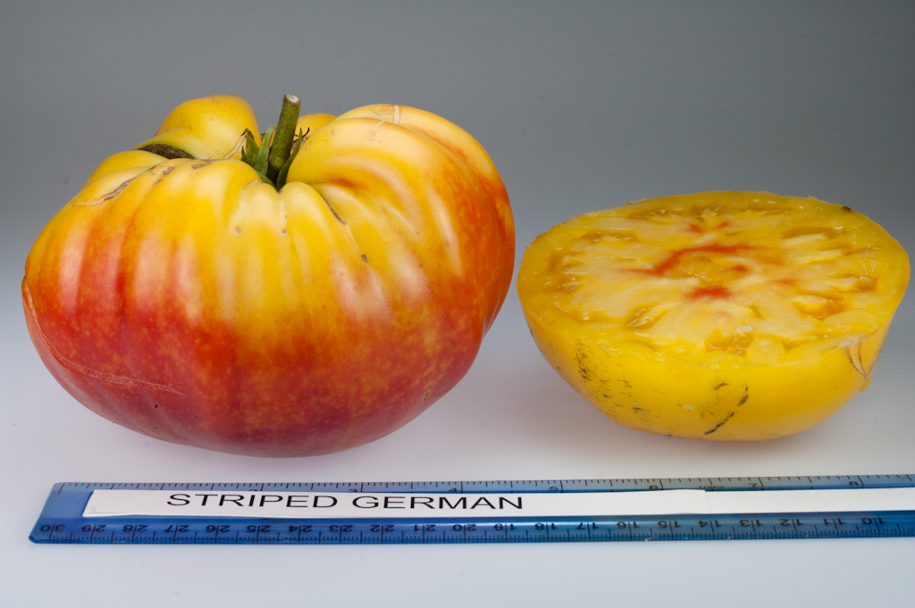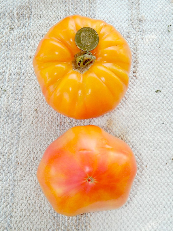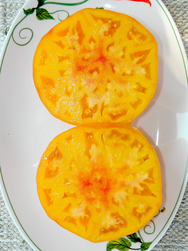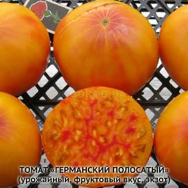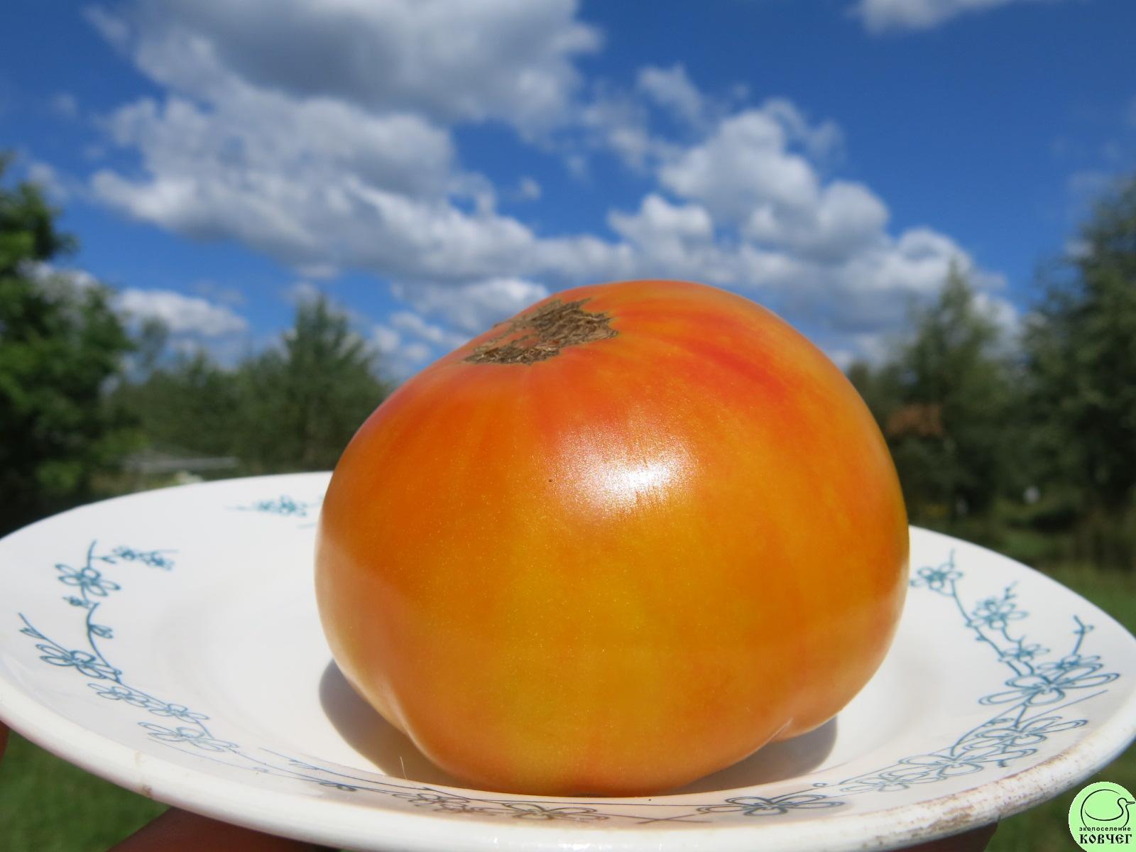 Сорт с очень вкусными крупными плодами, средним весом 400 г, нередко формирует плоды до 1 кг. Четырехцветный окрас — причудливая смесь желтого, оранжевого, кораллового и розового. Куст до 2 м., сплошная сочная и сахарная мякоть. Очень урожаен. Посмотрите, разве это не чудо!?
