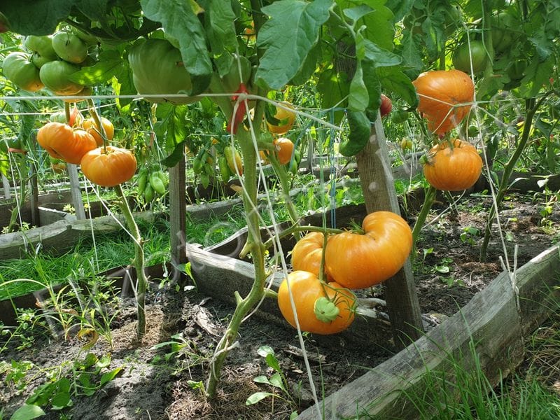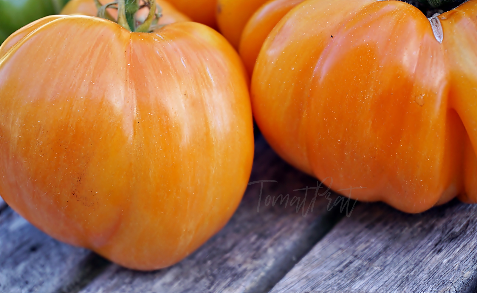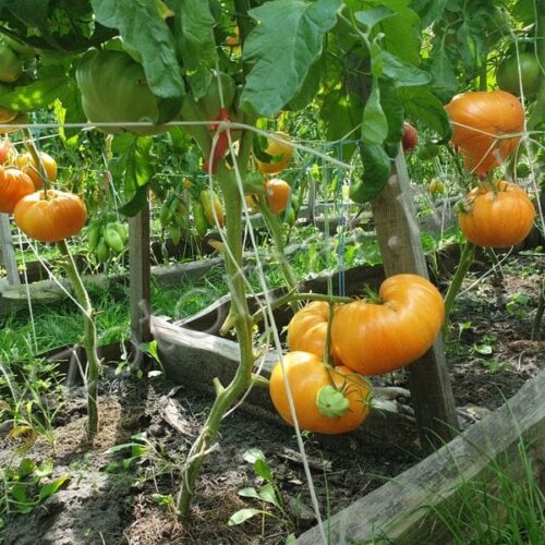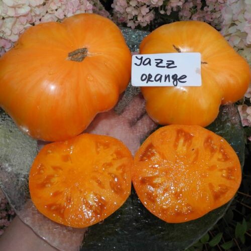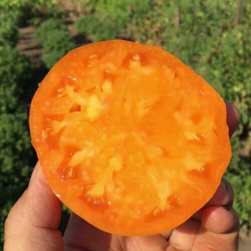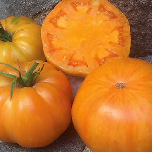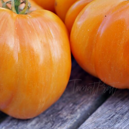 Высокорослый среднеспелый сорт любительской селекции из США. Мощные крепкие растения требуют обязательной подвязки к опоре, чтобы выдержать нагрузку урожаем. Плоды – роскошные, крупные бифштексы потрясающей красоты- ярко-оранжевые в розовую и темно-оранжевую полоску. Мякоть сочная, мясистая, очень вкусная, малосеменная ( сплошное помидорное»мясо». Средняя масса томатов 300-500г.