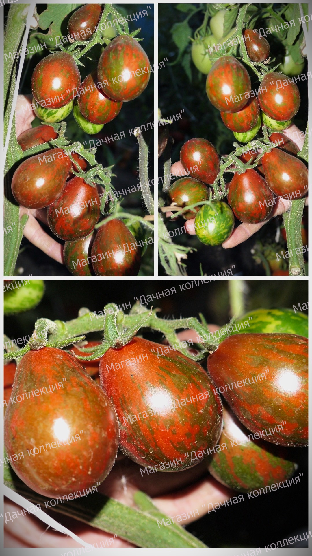 Среднеспелый очень урожайный высокорослый кистевой сорт с плотными пестрыми плодами. Растение нуждается в подвязке и формировании. Период от всходов до начала созревания 110-120 дней. Прекрасно завязывает плоды в стрессовых условиях. В простой красивой кисти 6-10 плодов массой 40-60 г, округло-грушевидной формы. Томаты гладкие, пурпурно-малиново-шоколадного цвета, с зеленовато-бронзовыми штрихами. Благодаря плотной кожице, плоды идеально подходят для консервирования, а высокое содержание антиоксидантов, неповторимый вкус и декоративность заслуживает особое внимание среди любителей свежих летних салатов и овощных нарезок, а также вяления и заморозки.