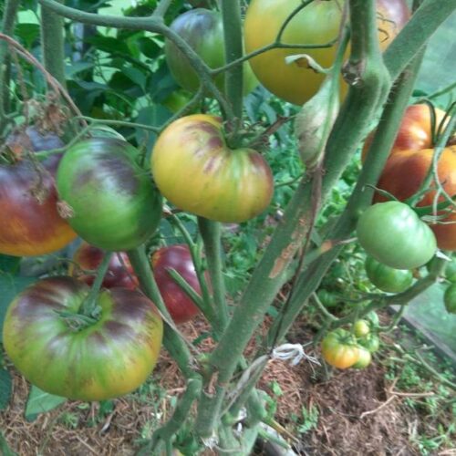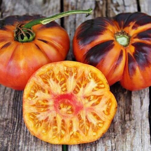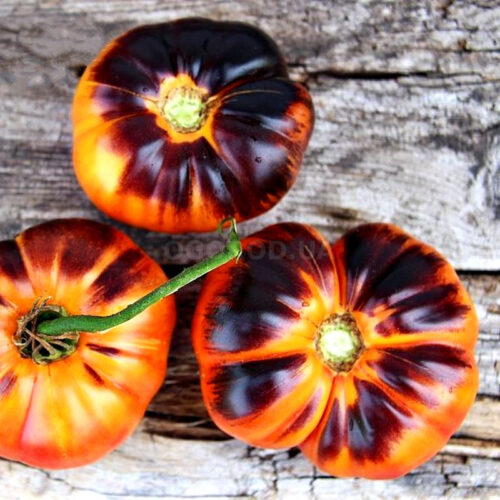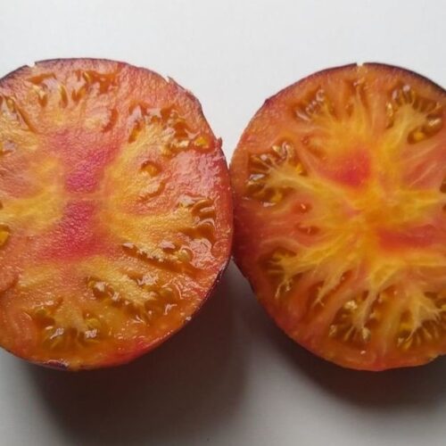 Высокорослый среднеспелый экзотический томат от американского селекционера Бреда Гейтса. Плодоносит до заморозков. Обладает отменной урожайностью и устойчивостью к болезням томатов. Томаты большие, плоскоокруглые, очень мясистые, в спелости красно-желтые с фиолетовыми брызгами на боках, средним весом 200-300г. На кусте их очень много. Мякоть желто-оранжевая с красным пятном в центре плода. Сбалансированный сладкий вкус, сочные и плотные томаты.