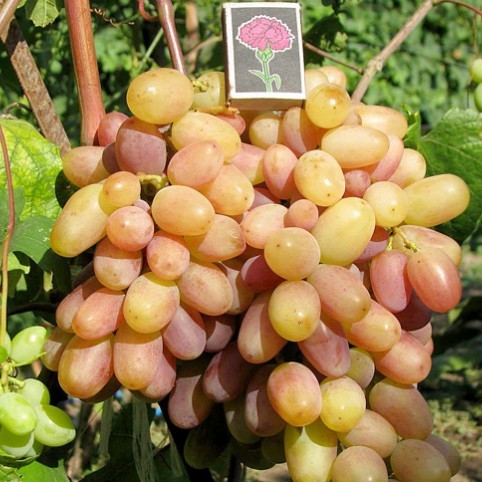 • Сами грозди различного размера и этот фактор не связан с уходом. Согласно не большим исследованиям средняя масса составляет от половины килограмма до 750 граммов, хотя при тщательном уходе не исключено, что грозди могут иметь вес до одного килограмма и более, что непременно порадует любого любителя. Сорт имеет ягоду усредненной плотности, которая не превращается в горох. Ее размеры зависят от величины грозди или чем больше гроздь, тем больше ее плод, масс его составляет около 15 грамм. Форма их овальная или напоминающая палец с наконечником. Их цветовая гамма бывает в диапазонах от нежного оттенка – розового или сиреневого до более насыщенного красного или фиолетового, но последние наблюдаются в период полного вызревания. Описание вкусовых качеств гармонично, кожица видна невооруженным глазом, но при непосредственном употреблении не ощущается ее присутствие.